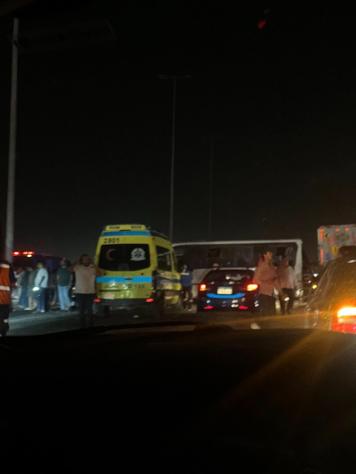 ضحايا ملقون على الأسفلت، أصوات صراخ مدوية، ومصابون عالقون داخل السيارات، مشهد دموي شهدته طريق السويس بعد حادث تصادم مروع بين 3 سيارات نقل ثقيل (تريلا)، 5 سيارات ملاكي، وأتوبيسين.
