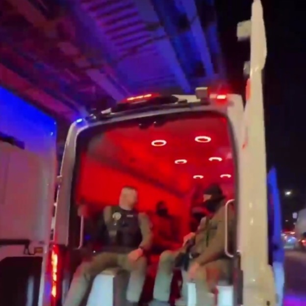 تظهر اللقطات قيام رجال الشرطة بعمل استعراض للقوة خلال العربة المفتوحة و تجاوبهم