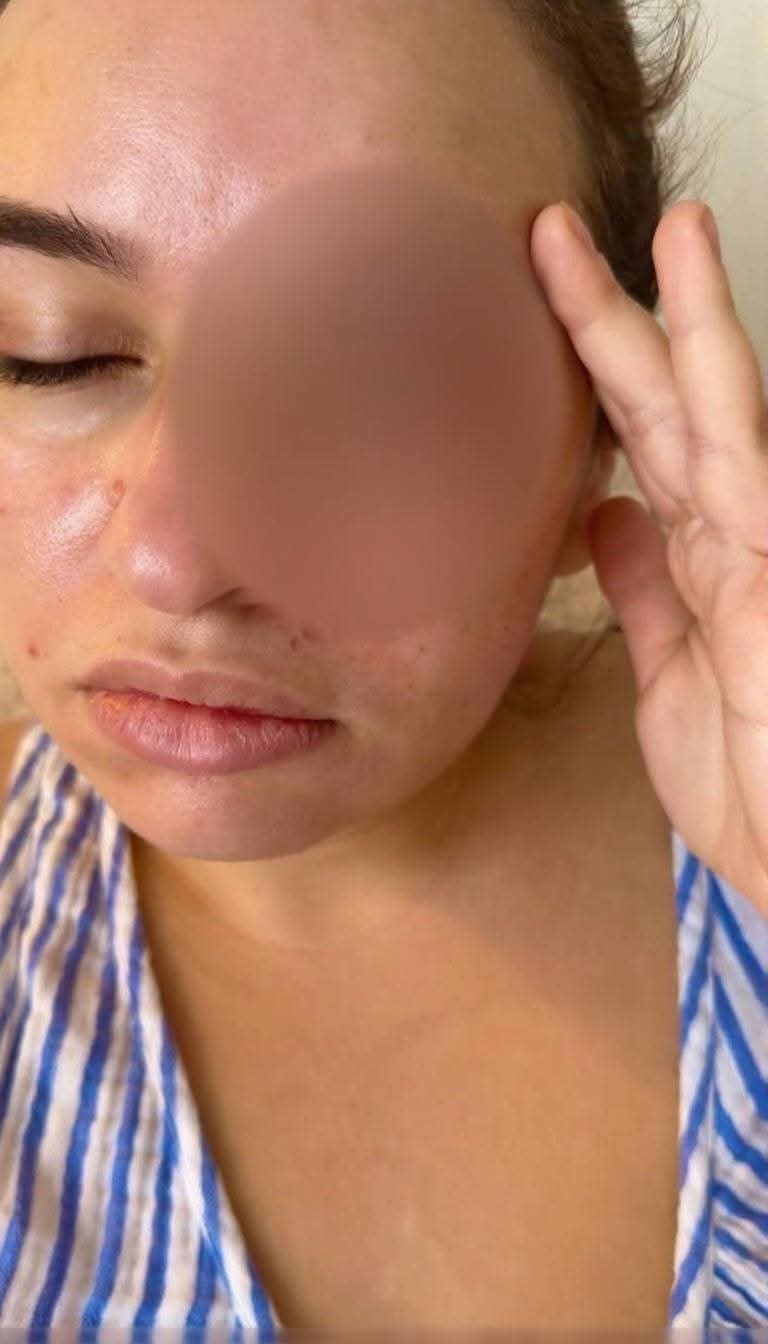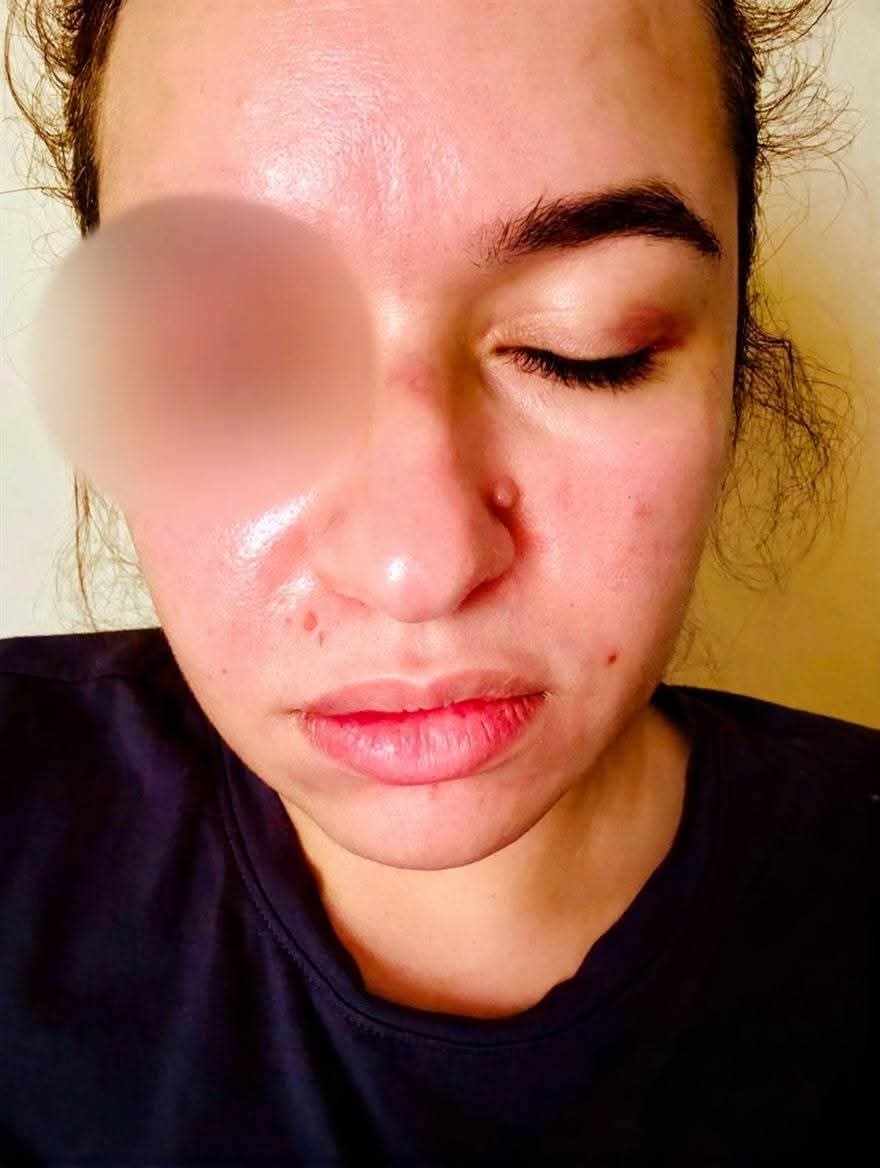 الأنف والجبهة والذراع والعين اليسرى، الأمر الذي استدعى نقلها إلى المستشفى