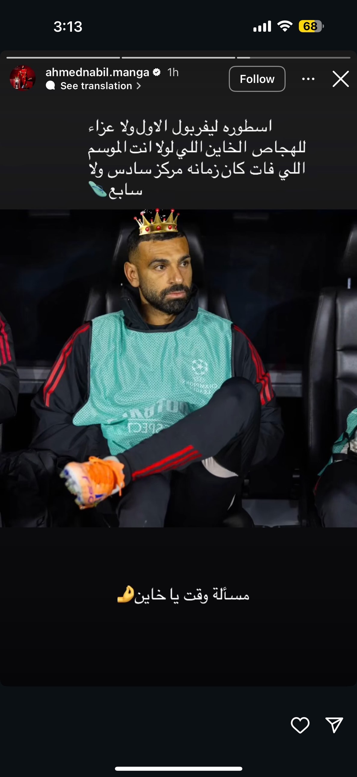 وجه احمد نبيل مانجا لاعب الأهلى السابق وصديق محمد صلاح المقرب رسالة إلى ارني سلوت مدرب ليفربول عبر ستورى انستجرام.